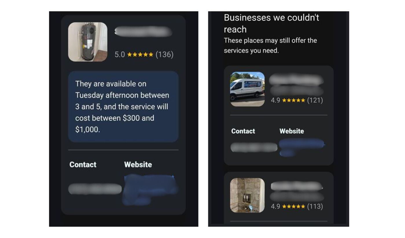 Once the information is collected, Google sends the homeowner a summarized comparison via email or text. Businesses that provided usable pricing and availability are shown first, complete with ratings, price ranges, and contact links. Businesses that couldn’t be reached or didn’t provide information are pushed into a separate “Businesses we couldn’t reach” section and are visually de-emphasized.
